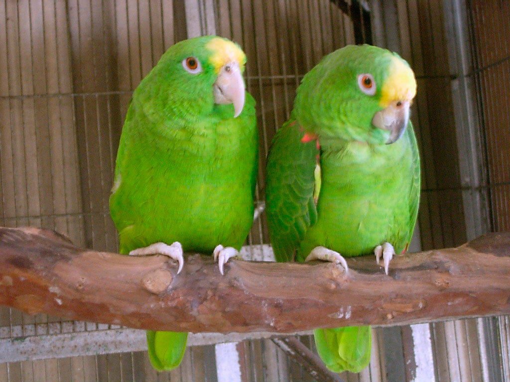 (4) – Deux Amazones Festive dans une volière au parc l`oiseaux dans l`Oblast de Kalouga, Russie. Ils sont la sous-espèce Amazona festiva bodini, nom commun Bodinus’ Amazone. Ils sont probablement se bousculent pour chambre sur leur perchoir par Remiz [CC BY-SA 2.0], Via Wikimedia Commons
